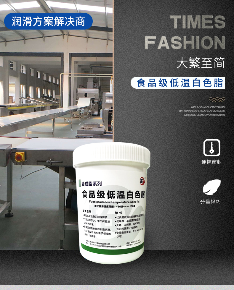 拓牌食品级低温白色脂是一款经过NSF认证的食品级润滑脂,可应用于食品医药等机械,对产品无污染,不含对人体有害成分。